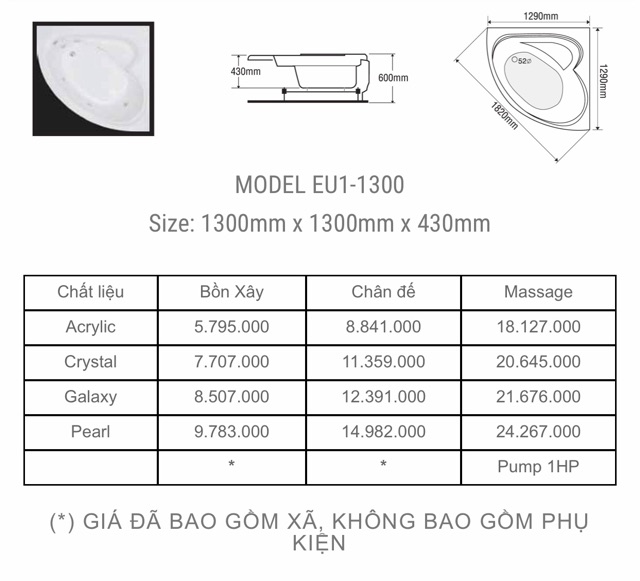 Tư vấn xin vui lòng ĐT/zalo : 0986586043-Bồn tắm EU1- 1300- Chất liệu Acrylic, Crytal, Galaxy, Pearl đã bao gồm xả chưa bao gồm phụ kiện