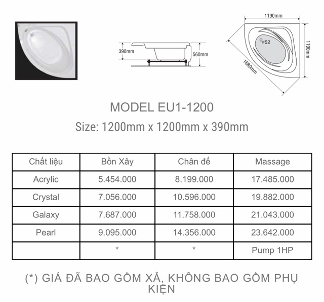 BỒN TẮM GÓC EUROCA - MODEL EU1 - 1200 - BẢO HÀNH 3 NĂM