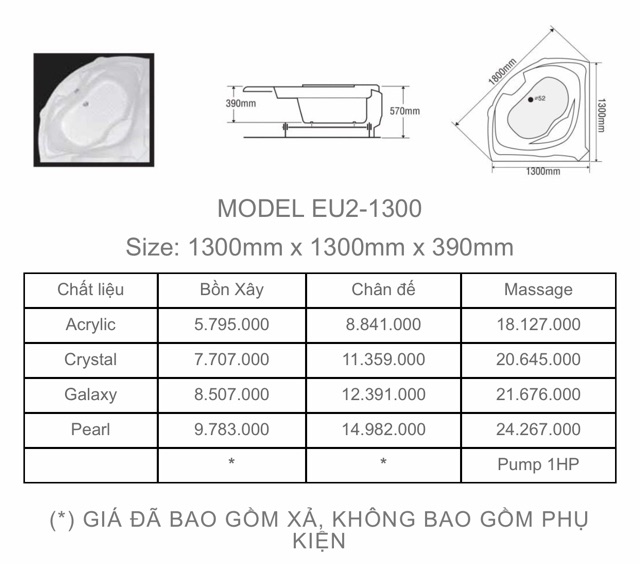 Tư vấn xin vui lòng ĐT/zalo : 0986586043-Bồn tắm EU2- 1300- Chất liệu Acrylic, Crytal, Galaxy, Pearl đã bao gồm xả chưa bao gồm phụ kiện