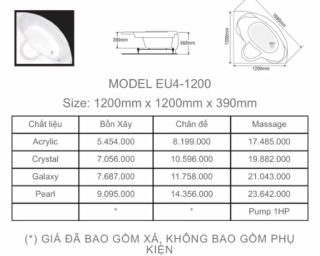 - Bồn xây và bồn chân yếm chưa bao gồm hệ thống vòi trên bồn. Chỉ có bồn Massage mới có hệ thống máy bơm, vòi Massage