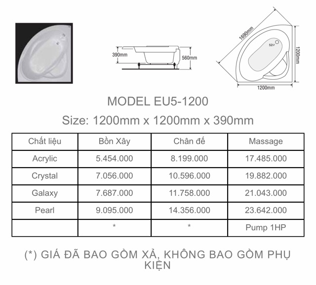 Tư vấn xin vui lòng ĐT/zalo : 0986586043-Bồn tắm EU5- 1200- Chất liệu Acrylic, Crytal, Galaxy, Pearl đã bao gồm xả chưa bao gồm phụ kiện