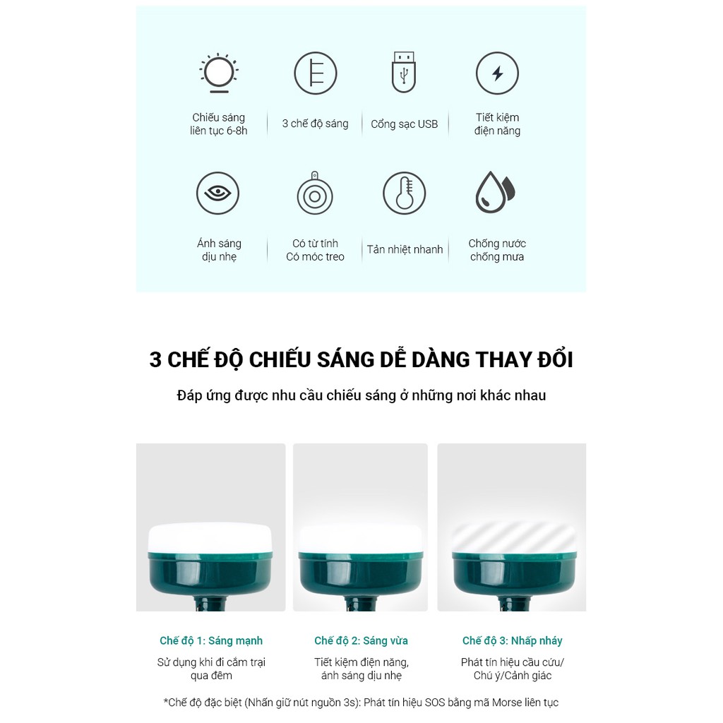 - 3 chế độ sáng : Sáng mạnh / Sáng vừa / Nhấp nháy