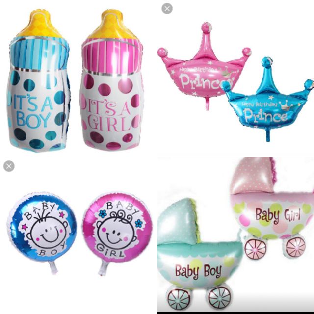 - sản phẩm gồm có các loại bóng: bình sữa, xe nôi, vương miện, baby tròn- màu: xanh, hồng