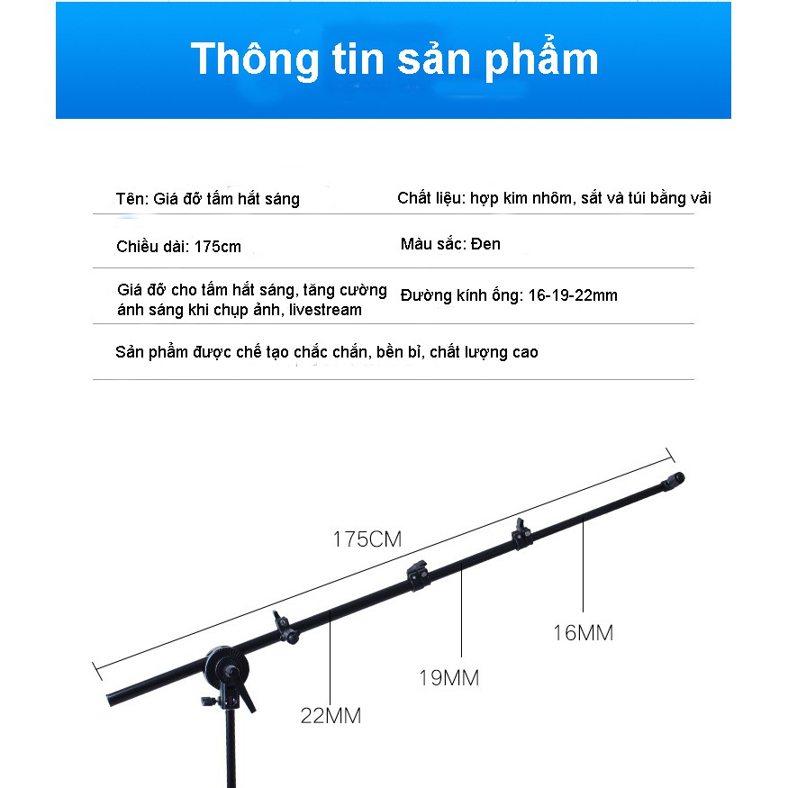 Cameras & Flycam > Phụ kiện máy ảnh > Thiết bị ánh sáng và phòng chụp || Tay boom treo tấm hắt sáng cho studio chuyên nghiệp, bộ gồm chân cao 2m, tay treo tấm hắt sáng 175cmCòn hàng