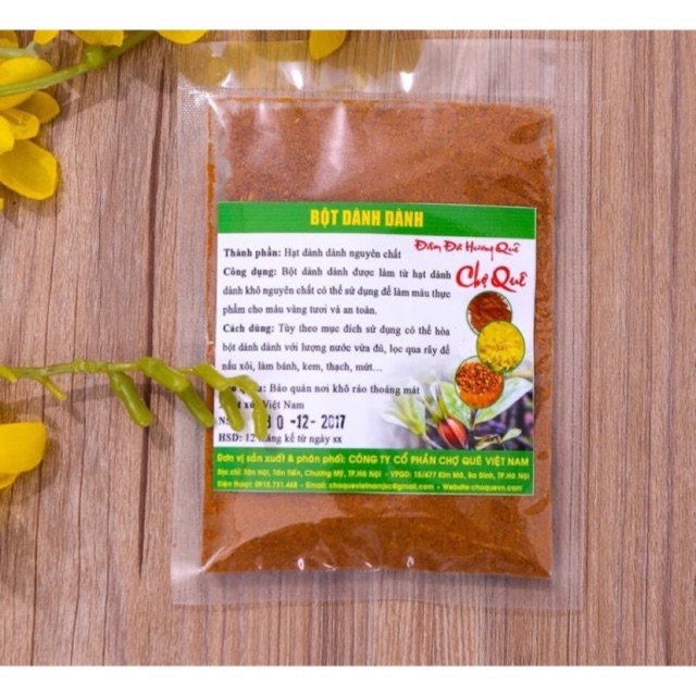 Đóng Gói: Được chia lẻ 10G đóng túi zipBột dành dành được làm 100% nguyên chất từ hạt dành dành (hạt của quả dành dành) có mùi thơm đặc trưng và cho màu vàng đẹp mắt giúp tạo màu cho xôi, chè, bánh, thạch...