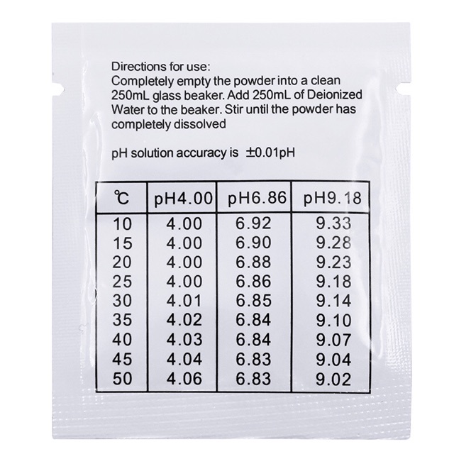 Được sử dụng để hiệu chuẩn axit PH và bút thử kiềm, mỗi gói có thể được chuẩn bị với dung dịch chuẩn 250ML