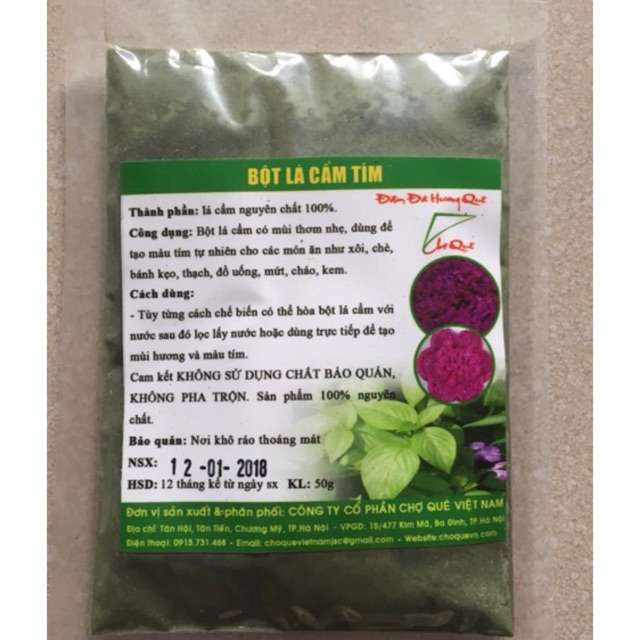 - Bột có thành phần 100% lá cẩm tím sao khô và xay nhuyễn, hoàn toàn từ tự nhiên, không chất bảo quản, không pha trộn, an toàn cho sức khỏe người tiêu dùng.