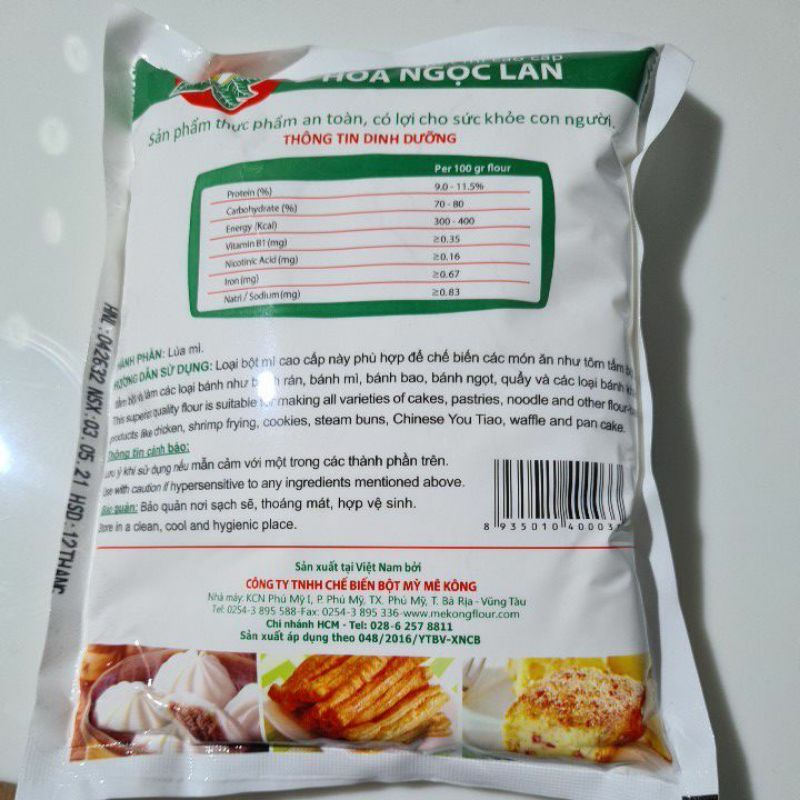Bột mì Hoa Ngọc Lan túi 500gBột mỳ Hoa Ngọc Lan được sử dụng nhiều trong gia đình với các món ăn như tôm tẩm bột, gà tẩm bột , quẩy rán, bánh mì, bánh rán, bánh bao, bánh xèo ,vỏ bánh trung thu và các loại bánh khác.