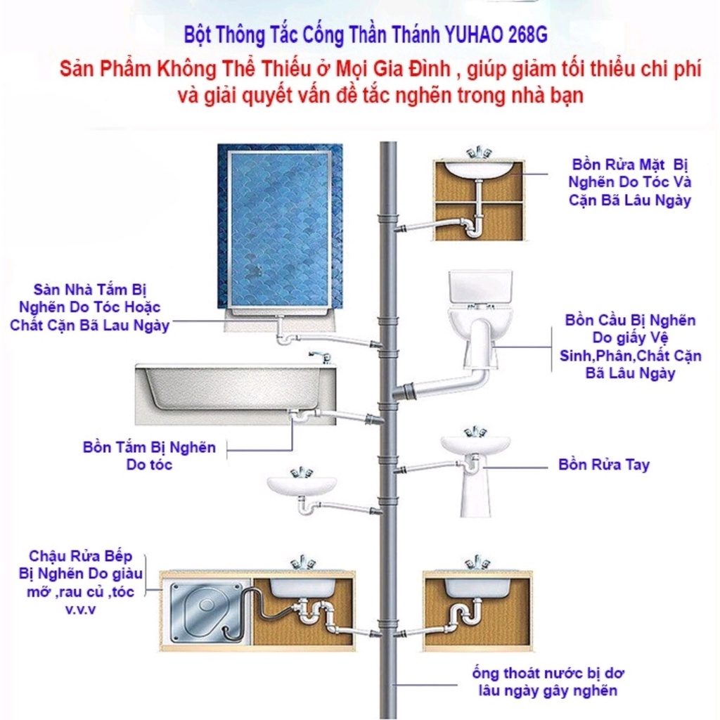 ✪ Bột Thông Cống YUHAO giúp bạn xoá bỏ lo lắng khi tắc đường ống cống, tắc bể phốt,Bồn Cầu,Bồn Rửa Chén Bát,Thông Lavabo,đường ống ở trong phòng tắm, toilet, và nhà bếp v.v.v
