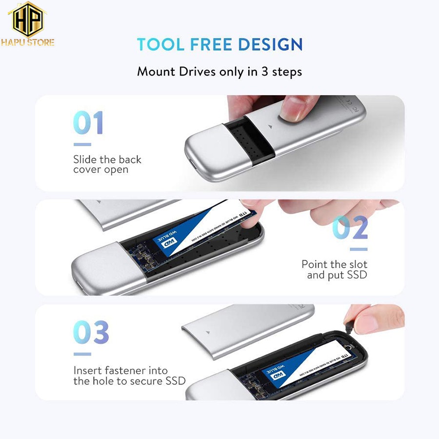 ◇ Sản phẩm tháo lắp dễ dàng chỉ cần trượt vỏ kim loại phía sau để mở vỏ, sau đó cắm SSD M.2 của bạn vào đầu nối B-Key Sata NGFF và sử dụng chốt đi kèm để cố định nó vào vị trí sau đó đóng nắp.