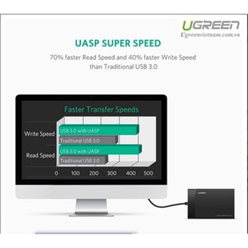 - Giao diện SATA của sản phẩm Ugreen 30847 hỗ trợ giao thức truyền tải tăng tốc UASP và giao diện USB 3.0 hỗ trợ tốc độ truyền tải dử liệu lên tới 5Gbps