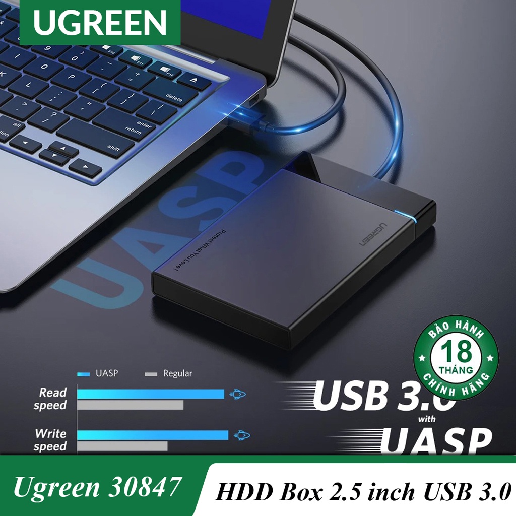 - Hộp đựng ổ cứng 2.5 inch Ugreen 30847 có thể giúp các bạn kết nối ổ cứng 2.5 inch với máy tính bàn, laptop và các thiết bị khác để truyền dữ liệu. Gíup bảo vệ khỏi những vết trầy xước bên ngoài và làm cho ổ đĩa cứng sata có thể lưu trữ dữ liệu. Tối đa hóa việc sử dụng HDD 2.5 "và SSD lại.