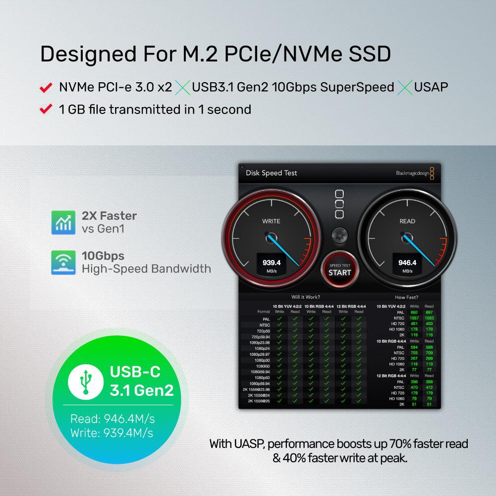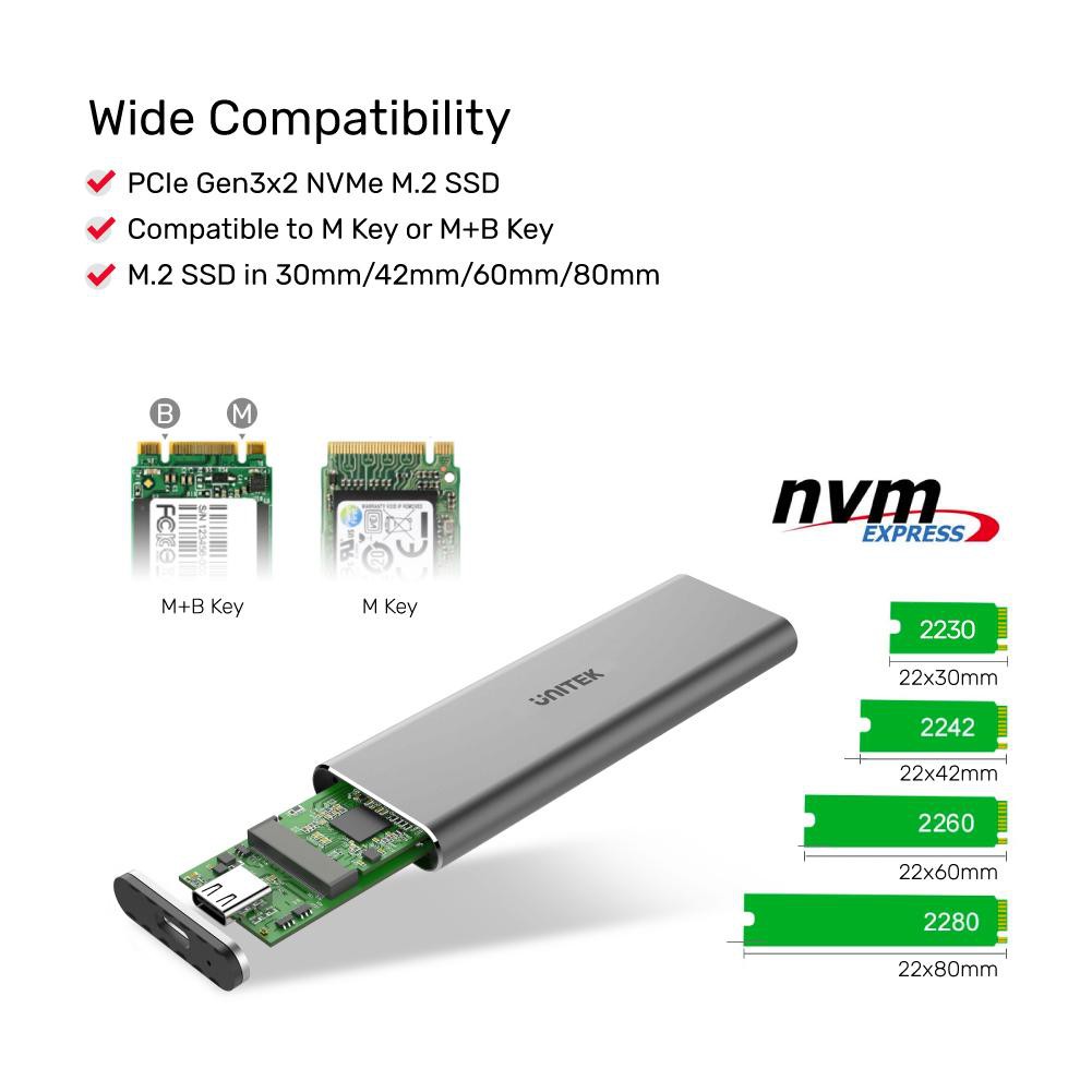 - Vỏ nhôm nhỏ gọn, tương thích với nhiều kích thước khác nhau của M-Key hoặc M + B Key M.2 SSD (PCIe / NVMe) (30mm / 42mm / 60mm / 80mm).