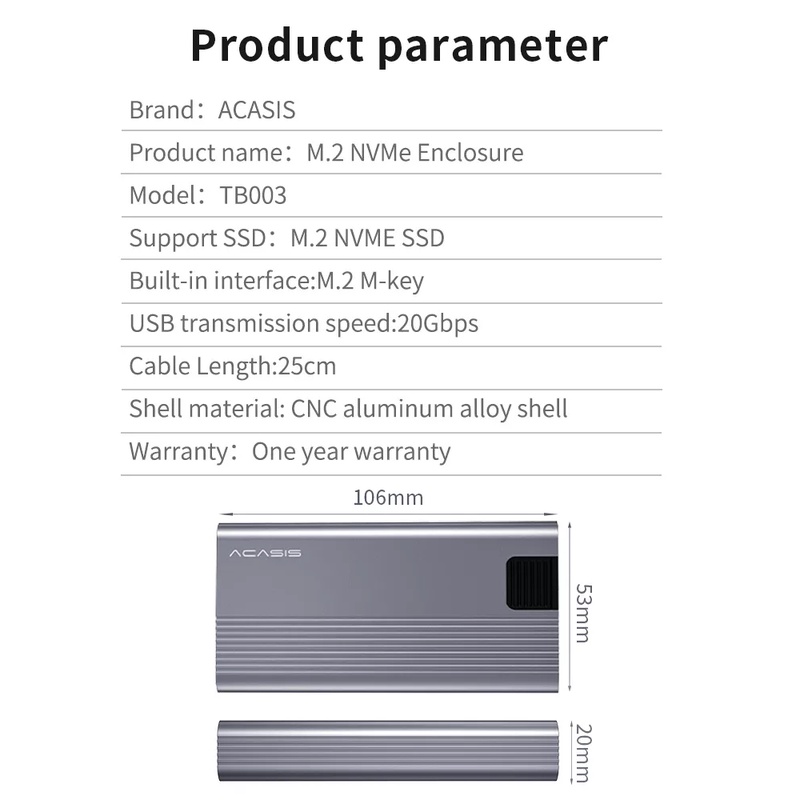 Thông tin box đựng ổ cứng SSD NVMe 20Gbps usb 3.2 gen 2x2 Acasis: