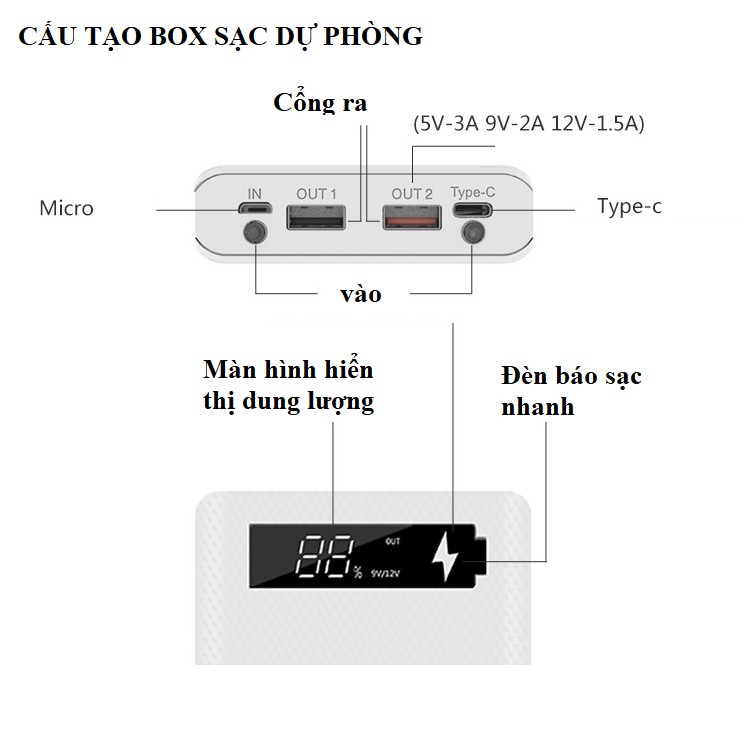 + Đầu ra 2 cổng ra: 5V/1A và 5V- 3A 9V-2A 12V-1.5A