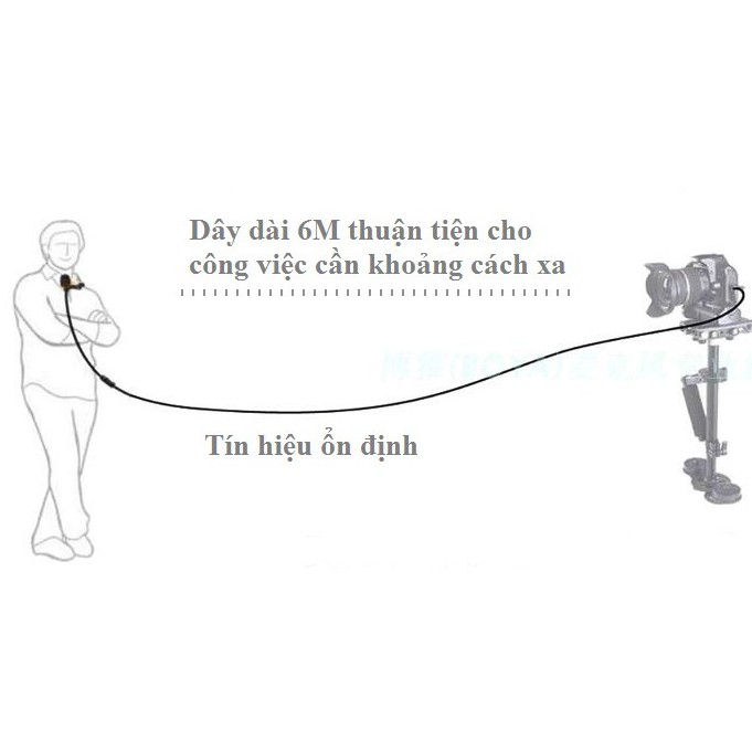 Dây dẫn của mic có độ dài lên tới 6m phù hợp cho các không gian khá rộng, để người dùng có thể đứng xa máy quay mà vẫn đảm bảo thu tiếng tốt.