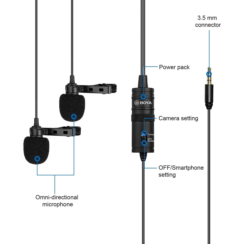 Giới thiệu BOYA BY-M1DM - Hàng Chính Hãng - Micro thu âm cổng 3.5mm | Thu cho 2 người | Dành cho Điện thoại & Máy ảnh