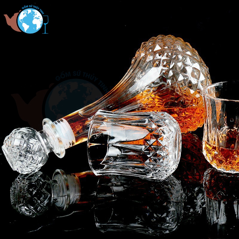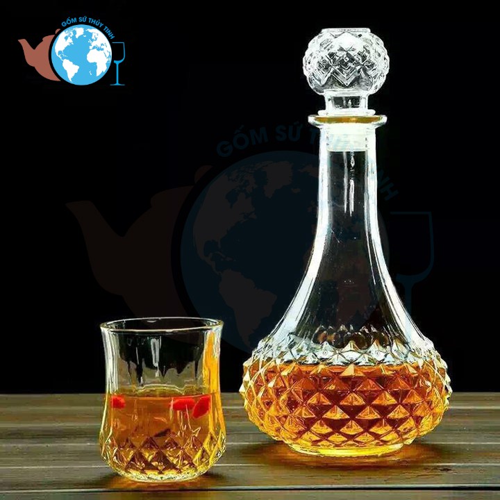 * Độ dày bình thủy tinh khoảng 5 li, kiểu dáng hình tháp, phần đáy phình bầu to họa tiết kim cương lập thể, phần thân thon nhỏ, nắp bình thủy tinh họa tiết kim cương lập thể, thiết kế kiểu dáng cao cấp tạo hình cao quý sang trọng, thủy tinh trong suốt, nổi bật được bình đựng rượu ngâm bên trong.