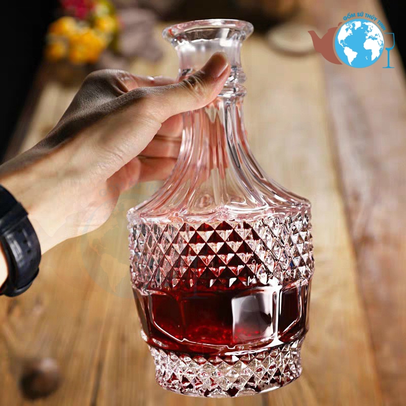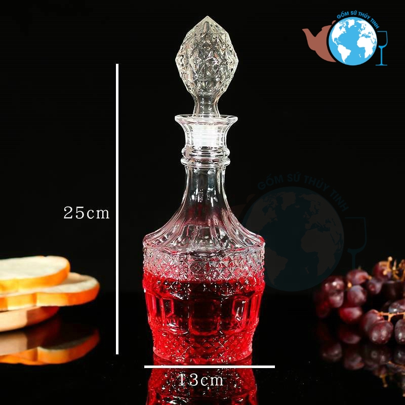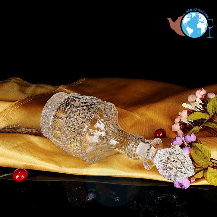 * Độ dày bình thủy tinh khoảng 5 li, kiểu dáng rất sang trọng, đầu nắp hình chóp họa tiết kim cương lập thể, phần cổ chai thân thon dài, phần thân to hình trụ trên tròn giữa thân góc cạnh và đáy hình tròn, thân có hoa văn và khắc họa tiết, thiết kế kiểu dáng cao cấp tạo hình cao quý sang trọng, thủy tinh trong suốt, nổi bật được bình đựng rượu ngâm bên trong.