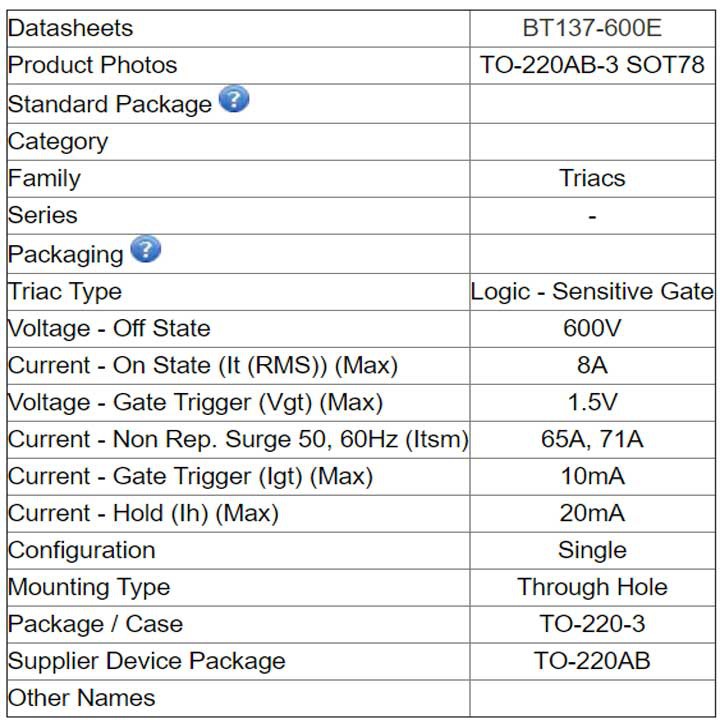 Thông số kỹ thuật:Điện ápm Triac: 600 V