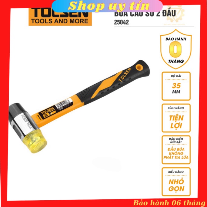 - Điểm nổi bật nhất chính của búa cao su 2 đầu Tolsen 25042 35mm là đặc tính đầu búa không phát ra tia lửa hay làm ảnh hưởng đến bề mặt vật dụng, giúp bạn có thể lát nền gạch khít hơn, chắc chắn hơn hoặc dùng để làm đồ thủ công mỹ nghệ hay đóng những vật liệu dễ vỡ, trầy xước...