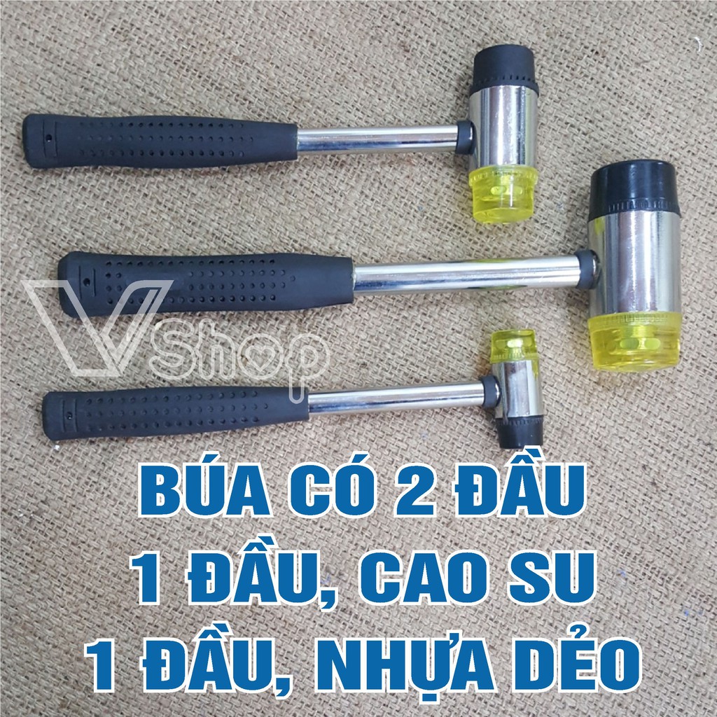 Búa được trang bị hai đầu búa, 1 đầu là chất liệu cao su, đầu kia, chất liệu nhựa dẻo. mục đích là để búa có 2 độ cứng khác nhau. Đầu nhựa dẻo, cứng hơn đầu cao su.