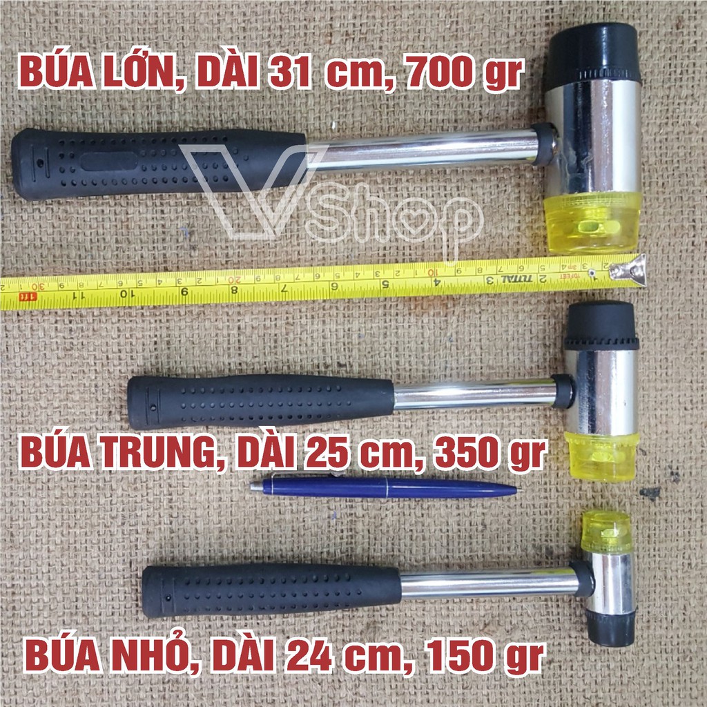 - Búa trung: dài 25 cm. đường kính đầu búa rộng 3,5 cm. nặng 0,35 kg ( 3,5 lạng ) nặng vừa phải, dùng cho những công việc cần lực đập trung bình ( thợ máy, thợ mộ tơ, thợ giày … )