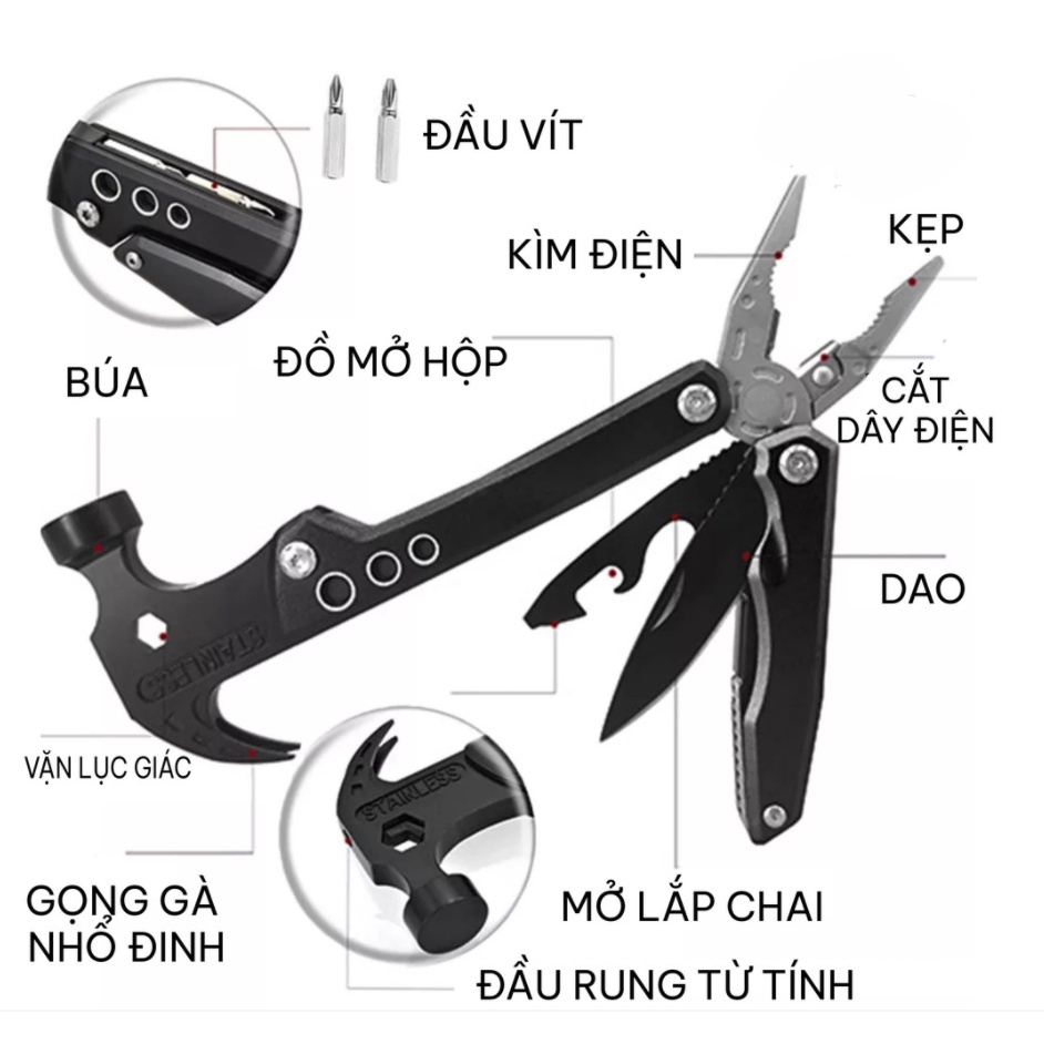 Búa Đa Năng Gấp Gọn Bằng Thép Không Gỉ, Kìm Kiêm Búa, Tô Vít Đa Năng 14in1 - Dụng cụ Đi Phượt - Cắm Trại Picnic
