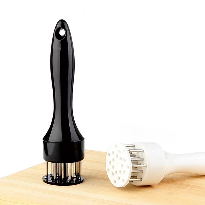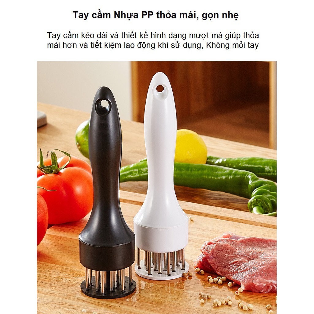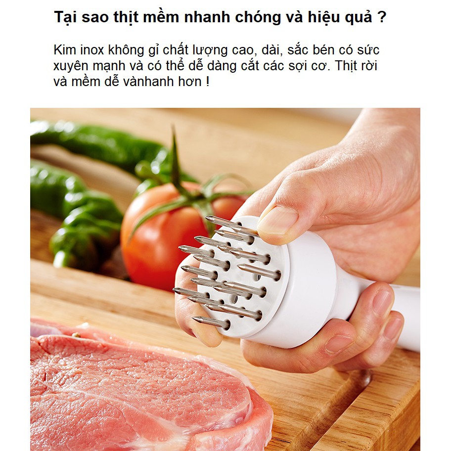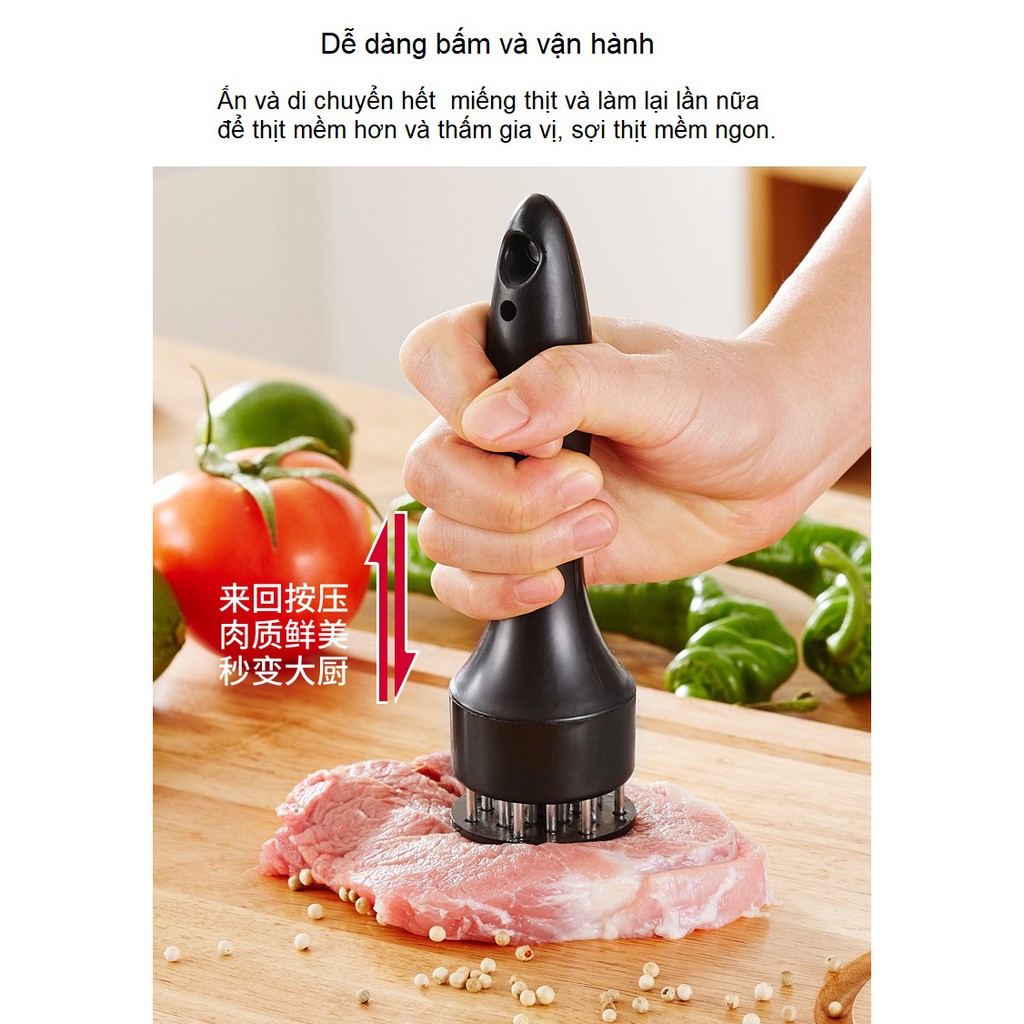 - Sản phẩm được làm từ nhựa cao cấp và thép không rỉ , có thiết kế nhỏ gọn , phần tay cầm vừa vặn , trọng lượng tuy không quá nặng nhưng khi được chịu tác động lớn sẽ có lực lớn lên miếng thịt , làm cho miếng thịt có độ dày đều hơn giúp thịt ngấm đều gia vị và chế biến nhanh hơn