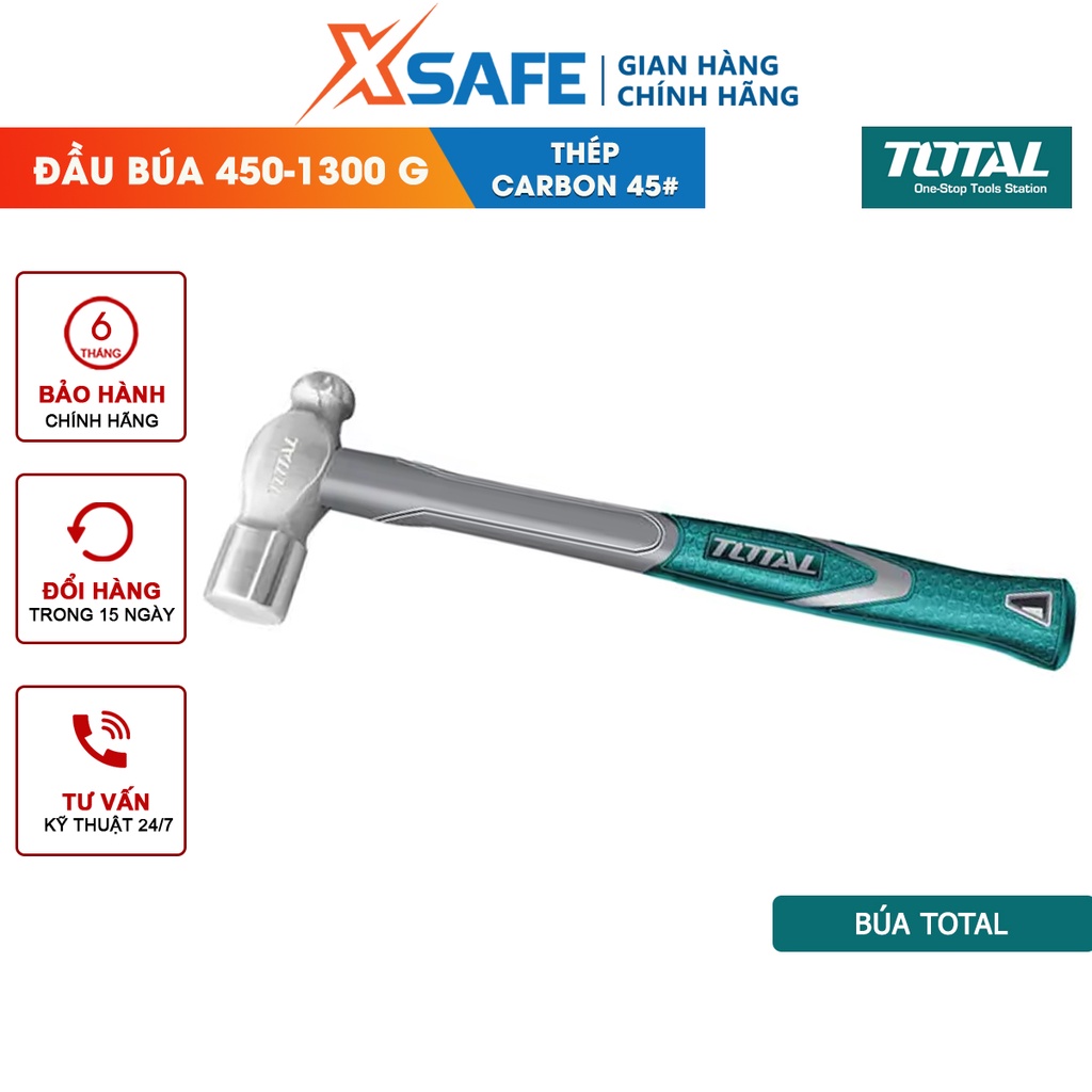 Búa đầu tròn TOTAL với kích thước nhỏ gọn và nhẹ, có thế làm việc ở những nơi chật hẹp một cách chuyện nghiệp mà không cần phải tốn quá nhiều công sức, được làm bằng chất liệu hợp kim cao cấp chắc chắn và bền bỉ, có khả năng chịu được nhiệt, chịu được lực, chịu được sức va chạm mạnh mà không bị biến dạng, có thể sử dụng liên tục mà không lo bị bào mòn hay nứt nẻ xảy ra trên đầu búa, có khả năng chống rỉ sét khi để ở trong môi trường ẩm ướt, có thể làm việc ở nhiều môi trường khắc nhiệt thuận tiện một cách hoàn hảo. Búa thường được sử dụng trong công nghiệp, chế tạo, sửa chữa, lắp ráp,...., dùng để đóng, gõ dụng cụ, nhổ đinh, tán kim loại...