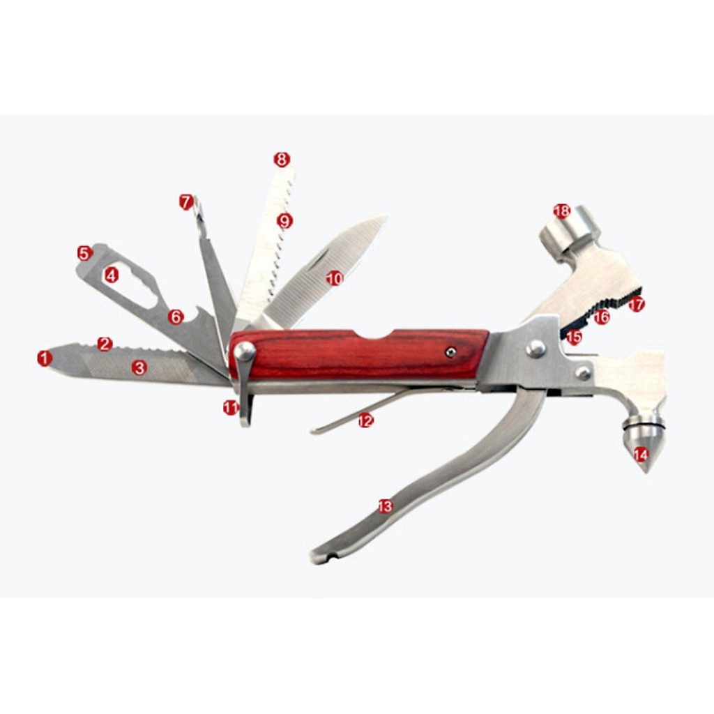 * Thân búa được tích hợp thêm 5 đầu lưỡi dao để mở nắp chai, cưa sắt, cưa gỗ, mở vít pake, mỏ lết 4 cỡ.v.v...