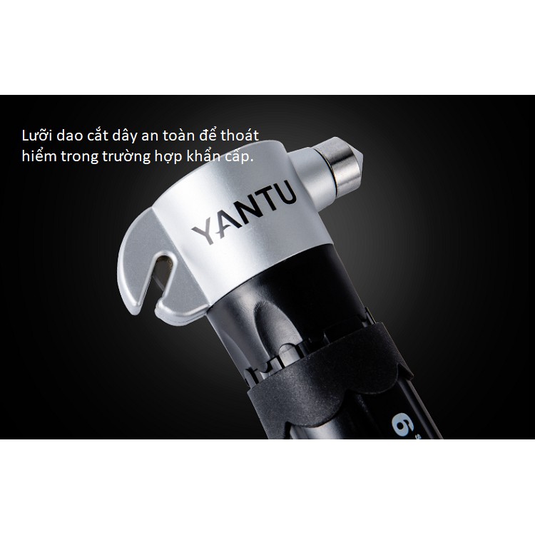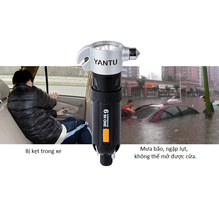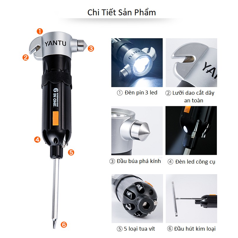 • Sản phẩm gồm 6 chức năng như đèn pin, lưỡi dao cắt dây, búa phá kính, đèn led vặn vít, tua vít, đầu hút kim loại• Đầu búa phá kính được thiết kế nhọn vật liệu bằng thép đặc, để dễ dàng phá lớp kính ngay lập tức.
