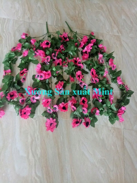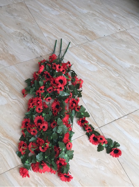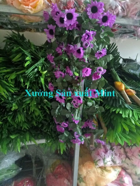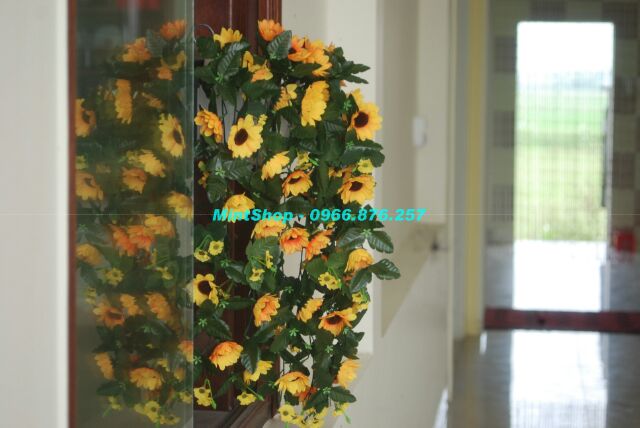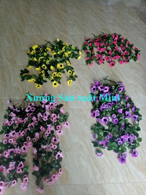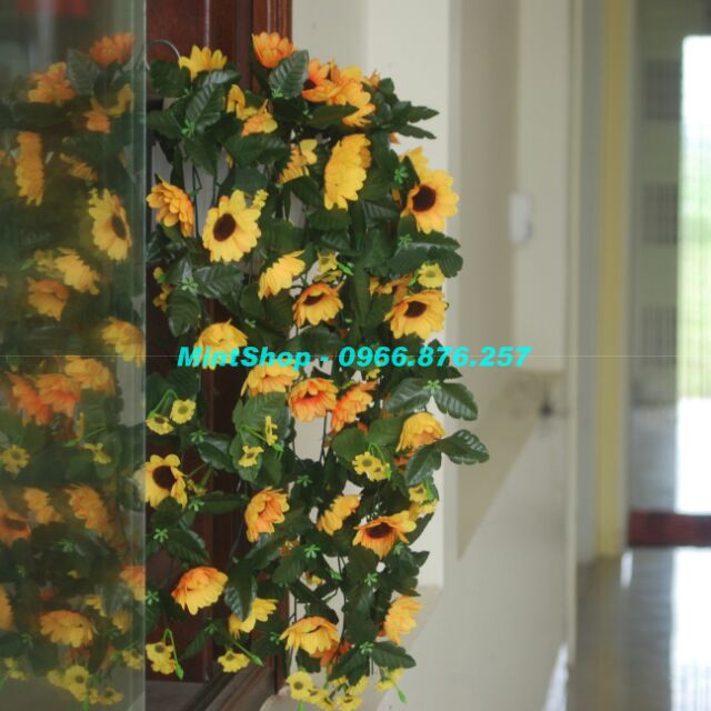 Bụi rủ hướng dương treo giỏ treo góc tường có gốc để cắm, k phải dạng dây quấn ạ, 1 chùm gồm 5 nhánh dài ~80cm- Mỗi nhánh gồm nhiều hoa và lá, xen kẽ hoa nhỏ