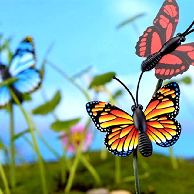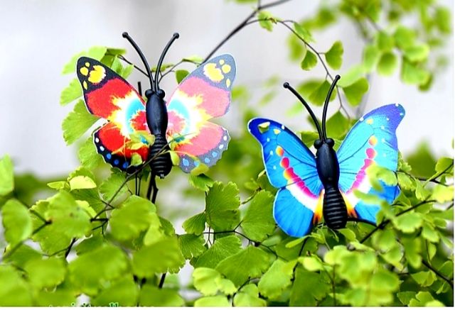 Bướm trang trí tiểu cảnh cây xanh, non bộ.Bướm bằng ngựa pvc, kết dính bằng keo xốp 2 mặt và nam châm.