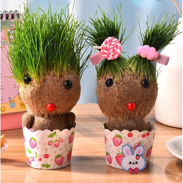 Búp bê đầu cỏ mọc tóc mini dễ thương trồng cây cỏ trang trí phòng học bàn làm việc tạo sự may mắn