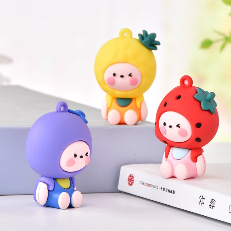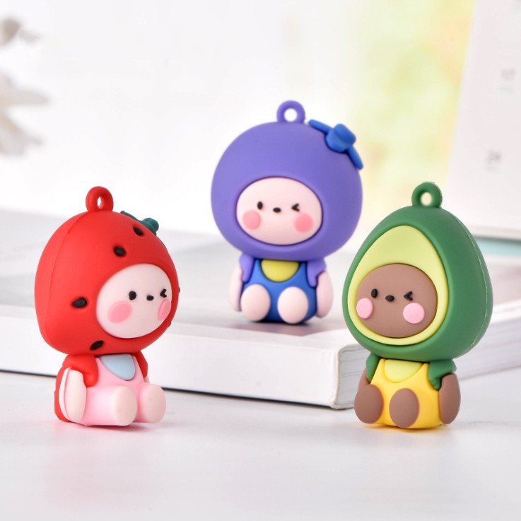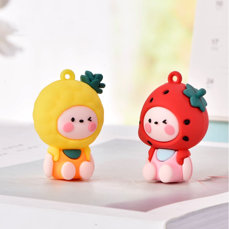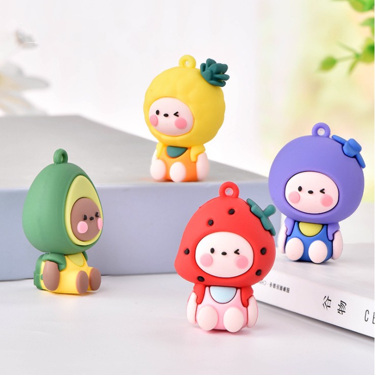 Chất liệu: nhựa mềm.Tạo hình sản phẩm là em bé đội mũ các loại quả có móc cao su để gắn móc khóa, gắn #Jibbitz hoặc trang trí ốp điện thoại, DIY