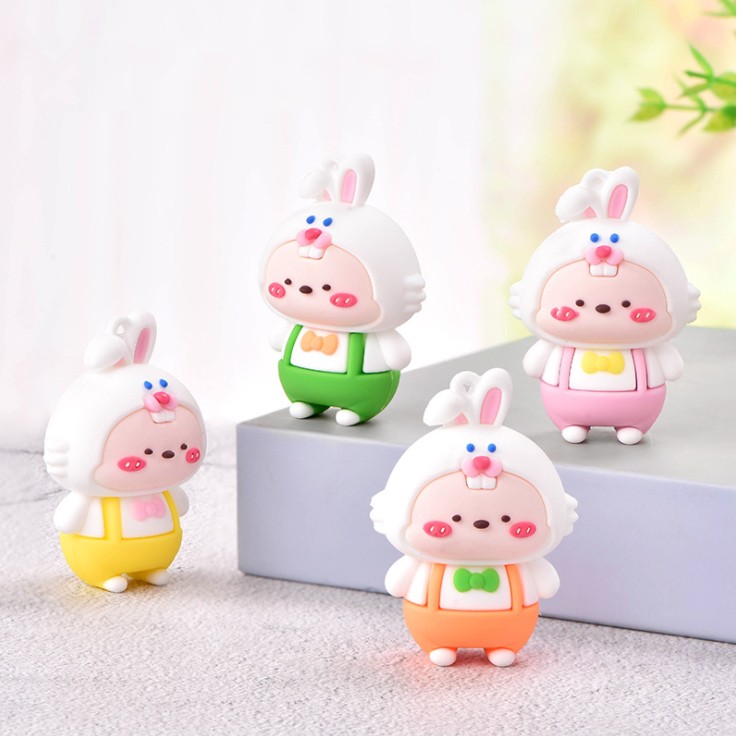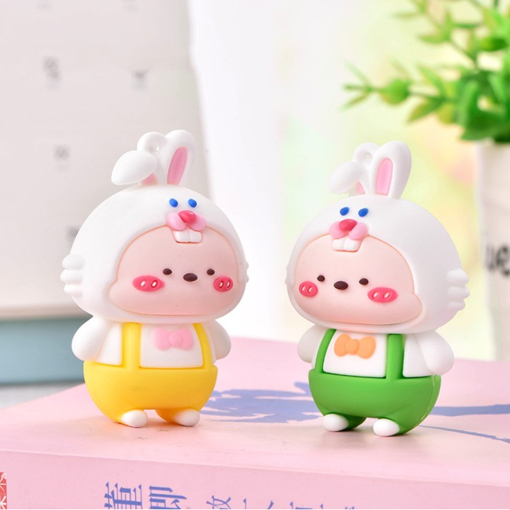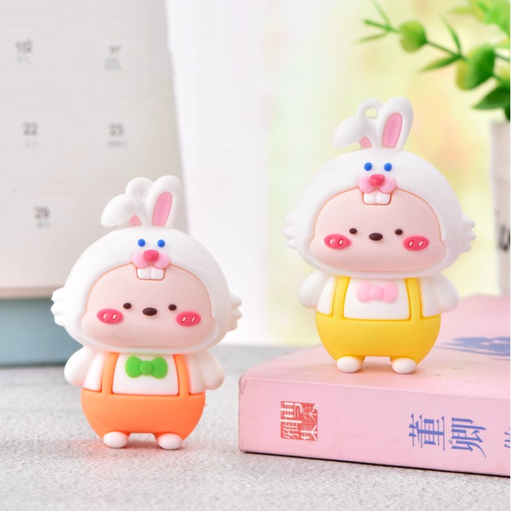 Chất liệu: nhựa mềm.Tạo hình sản phẩm là em bé mặc áo mũ Thỏ bông trắng có móc cao su để gắn móc khóa, gắn #Jibbitz hoặc trang trí ốp điện thoại, DIY