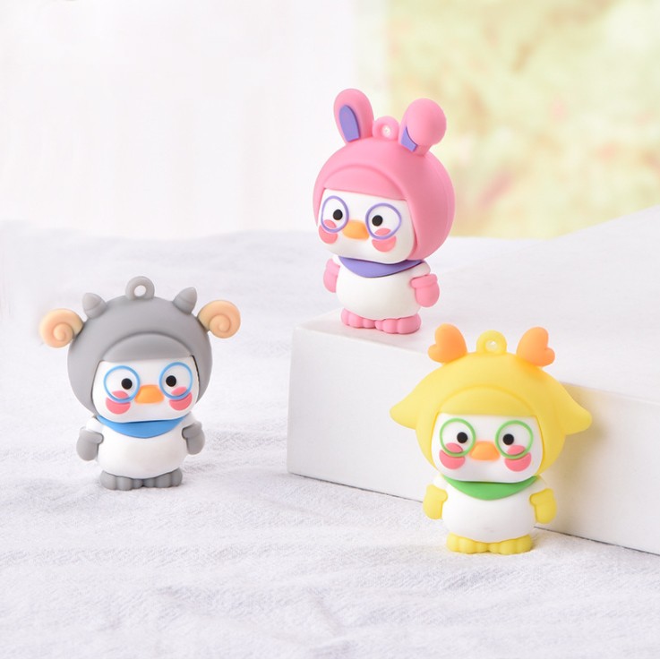 Chất liệu: nhựa mềm.Tạo hình sản phẩm là Vịt nhỏ đội mũ cosplay Thỏ, Dê, Gấu, Hươu có móc cao su để gắn móc khóa, gắn #Jibbitz hoặc trang trí ốp điện thoại, DIY..