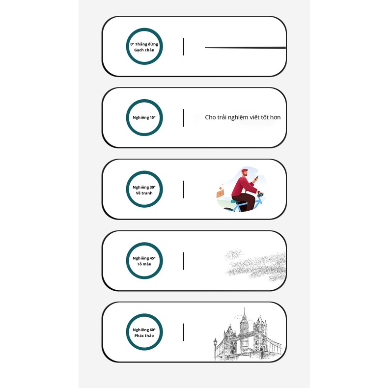 Cảm biến nghiêng ở đầu bút có thể tính toán chính xác hướng và góc nghiêng của bàn tay, nghiêng bút như một chiếc bút chì và tiếp tục chạm vào nó. Có thể tạo hiệu ứng với độ sâu và sắc thái khác nhau, nâng cao trải nghiệm vẽ tranh.