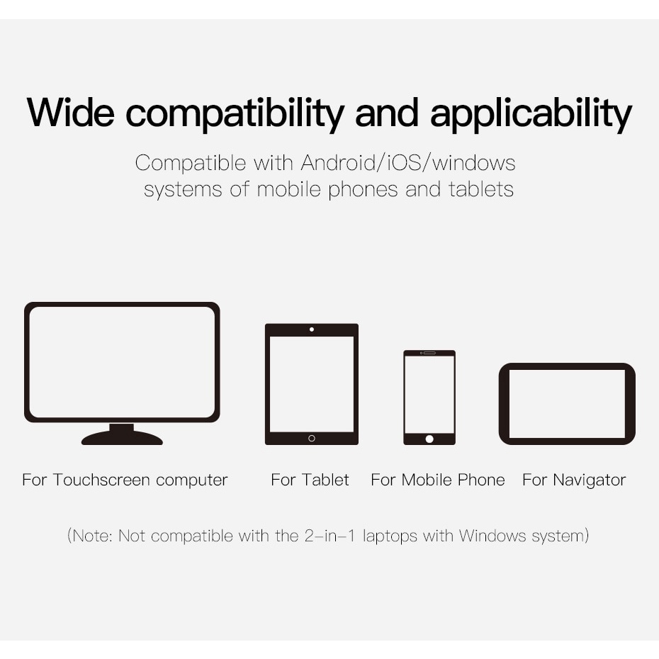 Chiếc bút cảm ứng dùng cho mọi màn hình cảm ứng điện dung. Tương thích tốt với tất cả các smartphone và tablet hiện này từ Android cho đến iOS. (Lưu ý: Không tương thích với máy tính bảng 2 in 1 của hệ điều hành Windows)