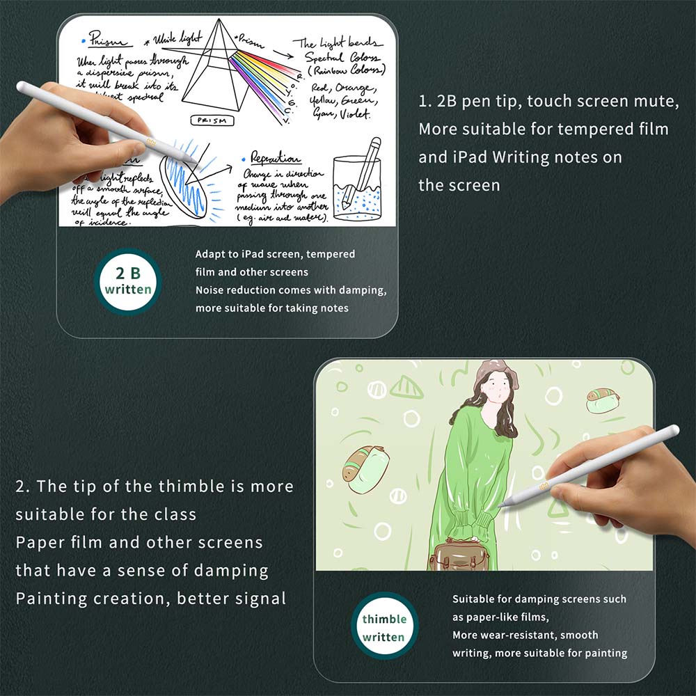 Bút cảm ứng ipad được trang bị đầu bút POM nâng cấp 1.5mm chính xác và mượt mà hơn, Không bị trễ, Không bị trượt, Không bị xước. So với các loại bút cảm ứng thông thường, ngòi bút này có độ bền cao hơn. Không cần cài đặt Bluetooth hoặc Ứng dụng. Bạn có thể sử dụng bút cảm ứng để duyệt Web, ghi lại ghi chú, vẽ tranh màu nước, phác thảo hoặc đánh dấu tài liệu.