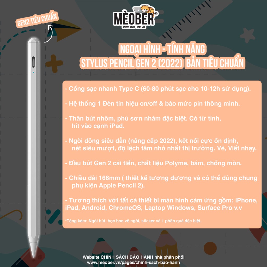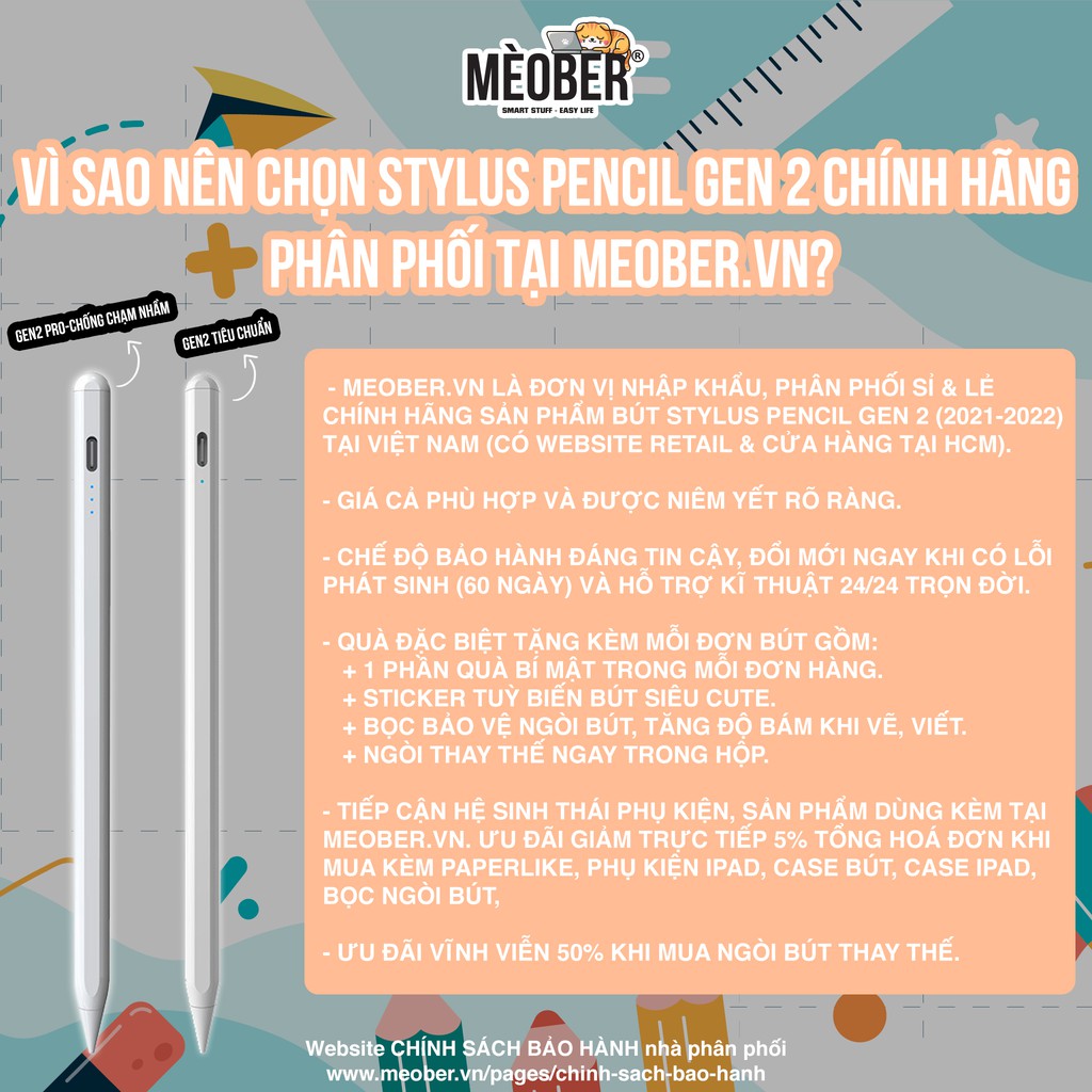 Bút cảm ứng Pencil Gen 2 Pro - Chống chạm nhầm, vẽ nét thanh nét đậm, ghi chú dành cho iPad là sản phẩm cần phải có để tận dụng tối đa khả năng của chiếc iPad của bạn!Chiếc Bút cảm ứng Pencil Gen 2 tại Meober.vn là loại mới 2022, cải tiến độ nhạy, khả năng ghi nhận góc nghiêng của bút, khả năng chống chạm nhầm tốt hơn, thậm chí pin cũng được nâng cấp và đặc biệt là hoàn thiện chất liệu nhôm phủ sơn nhám cao cấp, cho cảm giác cầm nắm sử dụng tuyệt vời!