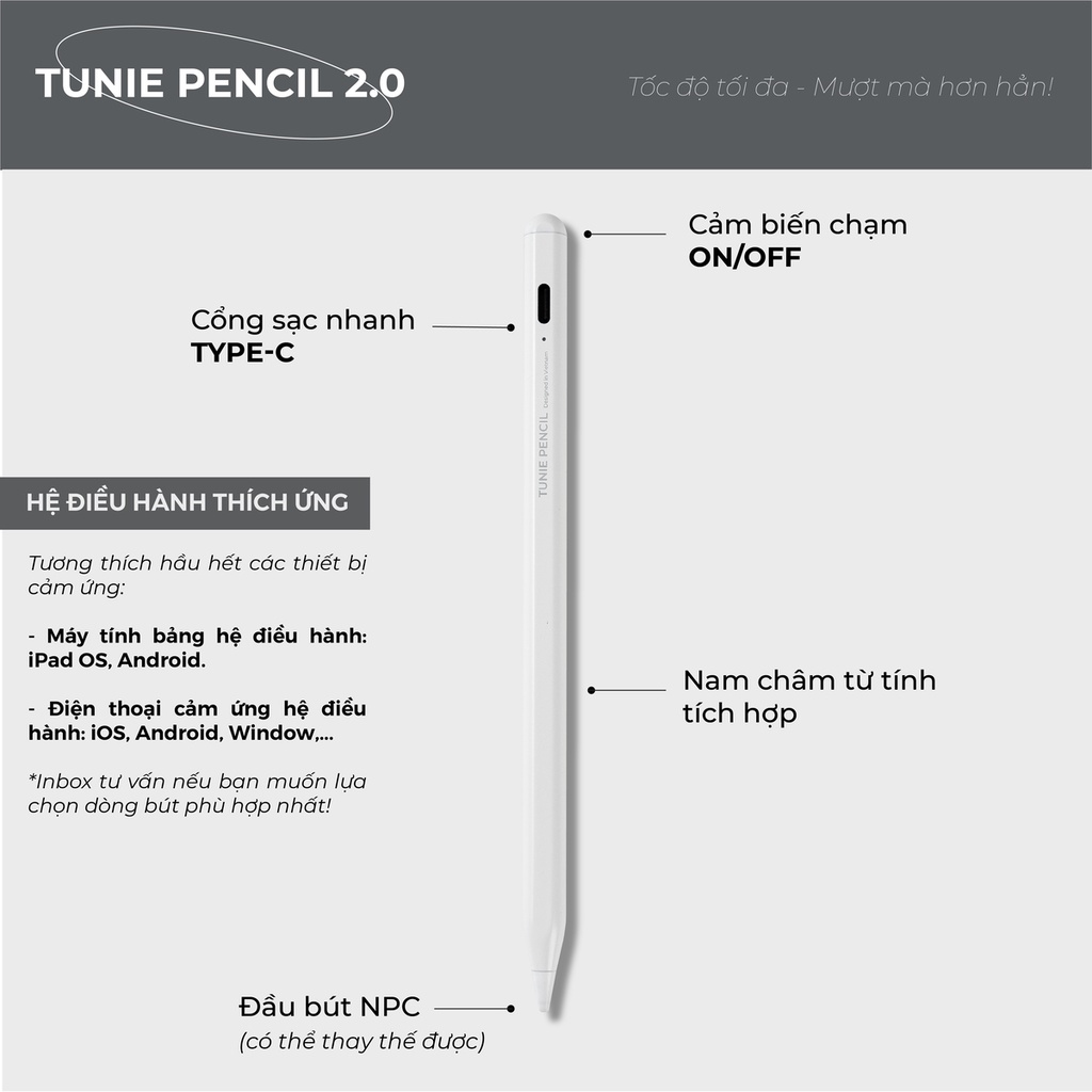 TUNIE PENCIL là sản phẩm được đội ngũ TUNIE VIETNAM đặt rất nhiều tâm huyết gửi tới bạn một sản phẩm mang chất lượng quốc tế, với giá thành hợp lý cho mọi nhà; để việc sở hữu một chiếc Pencil hoàn hảo không còn là rào cản trong học tập và làm việc của bạn nữa! Mong rằng bạn sẽ có những trải nghiệm tuyệt vời hơn nữa và những bước tiến xa hơn trong đam mê của mình bạn nhé!🌟 TUNIE PENCIL phiên bản 2.0 có thể sử dụng trên hầu hết tất cả các thiết bị iOS, Android và Window phone, phù hợp cho tất cả mọi người!