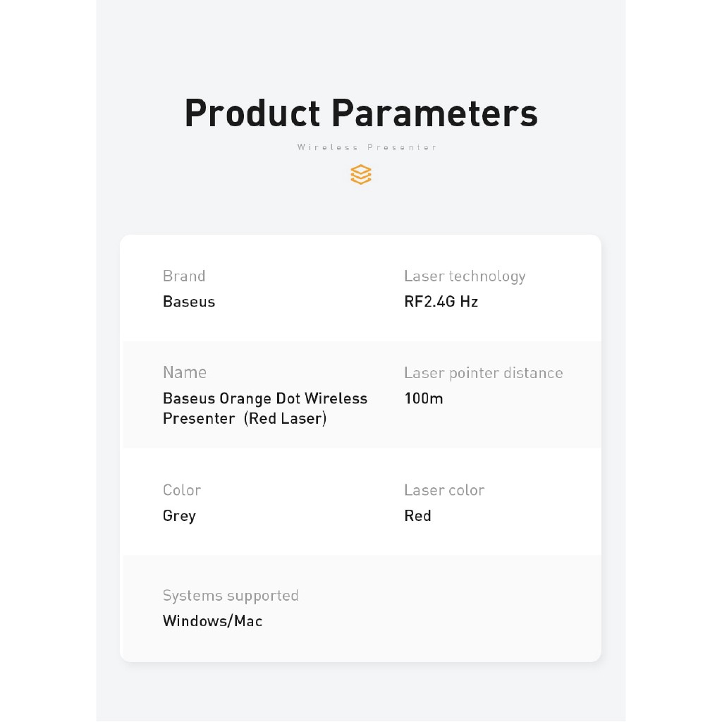 - Bút trình chiếu Baseus Orange Dot Wireless Presenter là một trợ thủ đắc lực không thể thiếu dùng cho các buổi thuyết trình nhờ được trang bị nhiều tính năng tiện dụng, hưu ích và cần thiết như : bút laser (laser poiter), điều hướng slide cho Powerpoint (page up/down), nút mở liên kết, nút tạm dừng khi phát video , nút show/hide ...