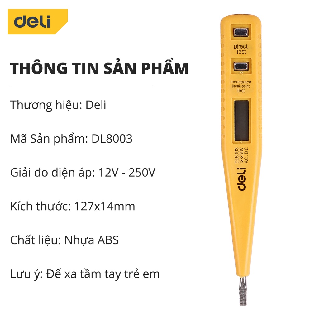 Nhà cửa & Đời sống > Dụng cụ & Thiết bị tiện ích > Dụng cụ > Khác || Bút Thử Điện Deli Chính Hãng 12-250V - Màn Hình Hiển Thị LED Kỹ Thuật Số Thuận Tiện - Vỏ Bút An Toàn - DL8005 / EDL8003Còn hàng