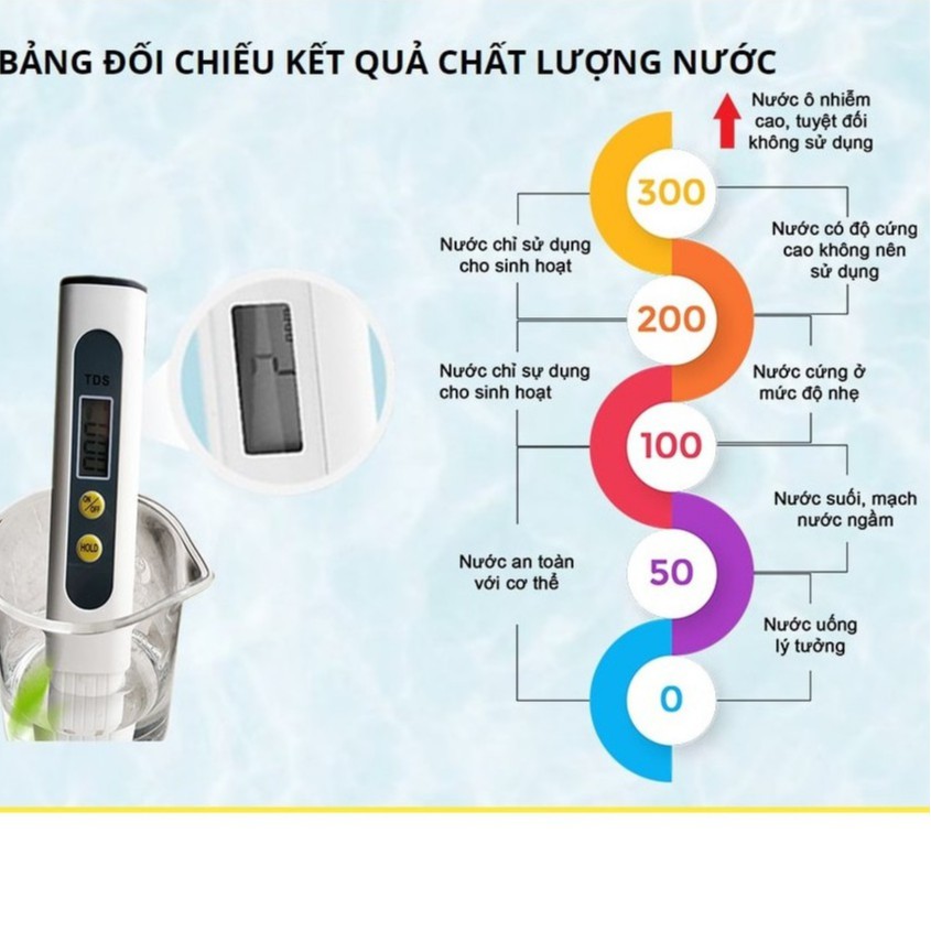 Cách đọc thông số trên bút thử: 0-50 ppm: độ tinh khiết cao, an toàn, có thể uống trực tiếp