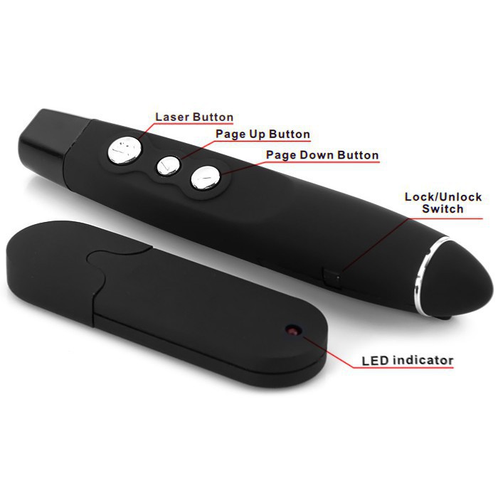 - Bộ sản phẩm bao gồm: 1 bút trình chiếu, 1 USB kết nối, 1 pin và 1 túi đựng