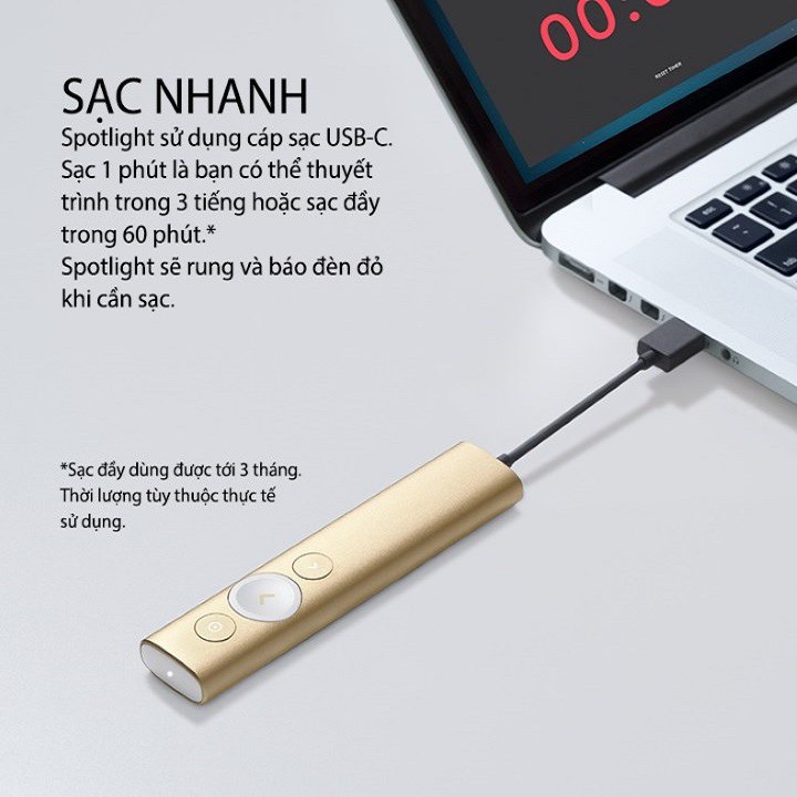 - Thời lượng pin sử dụng khi sạc đầy lên đến 3 tháng, và Spotlight còn có một tính năng độc đáo nữa, đó là bạn cài đặt thời gian kể từ khi bắt đầu trình chiếu đến khi kết thúc thông qua ứng dụng Logitech Presetation App, thiết bị sẽ rung lên thông báo cho bạn biết đã đến lúc để kết thúc.