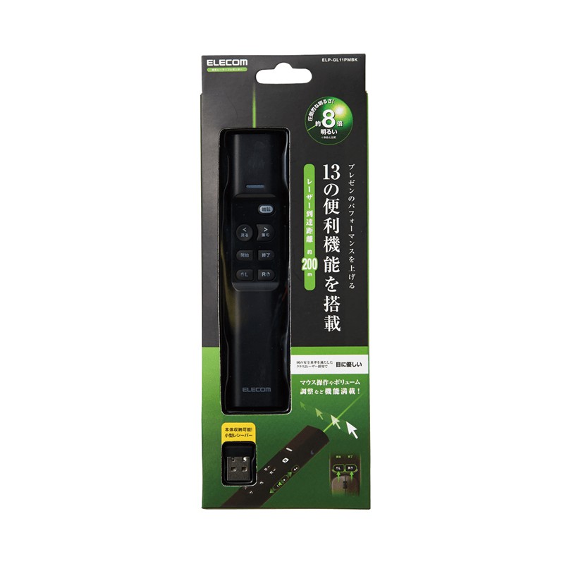 Bút trình chiếu đèn xanh ELECOM ELP-GL10P sử dụng một ánh sáng laser xanh, trang bị 13 nút chức năng tiện lợi để tăng hiệu suất của bản trình bày. Sản phẩm được sử dụng để tăng độ sáng rõ nét khoảng 8 lần so với tia laser đỏ thông thường (650 nm). Khoảng cách mà laser có thể chiếu được lên đến 200m, rất lý tưởng để sử dụng cho các địa điểm trình chiếu lớn.Nút bấm trực quan được làm nổi lên trên phần thân của thiết bị, giúp người dùng cảm nhận dễ dàng mà không cần phải nhìn trực tiếp vào nút.