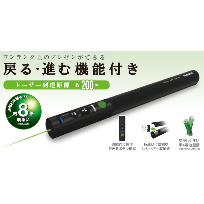 Thiết bị trình chiếu với đèn laser xanh chức năng tiện lợi để cải thiện hiệu suất trình bày như “chuyển tiếp” và “trở lại” của slide. Bút trình chiếu đèn xanh Elecom dùng thuyết trình, giảng dạy người cộng tác tuyệt vời cho buổi giảng dạy, thuyết trình chuyên nghiệp.